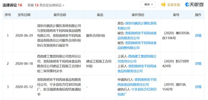 查阅天眼查后发现,贵阳南明老干妈风味食品有限公司存在16起法律诉讼。