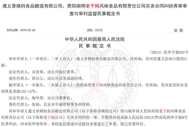 记者以“老干妈”为关键词搜索,裁判文书网在去年2月曾发布遵义香姨妈食品酿造有限公司、贵阳南明老干妈风味食品有限责任公司买卖合同纠纷再审审查与审判监督民事裁定书。