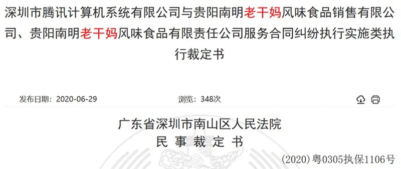 记者从中国裁判文书网获悉,深圳市南山区人民法院于6月29日发布了一则执行裁定书,同意原告腾讯请求查封、冻结被告“老干妈”相关公司名下价值1624.06万元的财产。