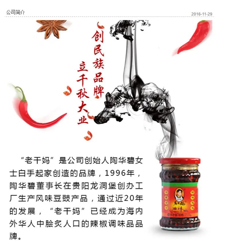 公开资料显示,“老干妈”是陶华碧于1996白手起家创造的品牌。公司官网显示,老干妈如今已拥有分布在贵州省内的三个生产厂区,总面积达750亩,员工近5000人。