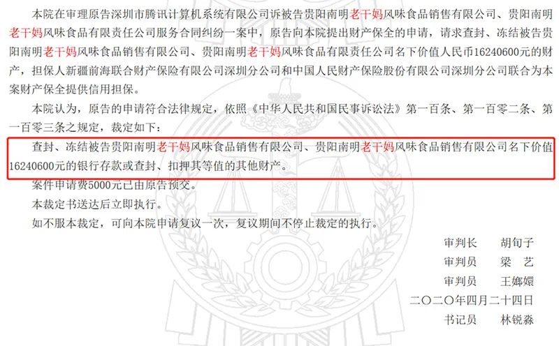 猛料!腾讯起诉老干妈 1600万元遭冻结