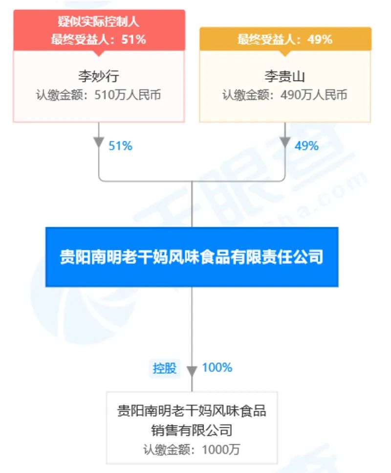 天眼查信息显示,贵阳南明老干妈风味食品有限责任公司有两位股东,李妙行持股51%,李贵山持股49%。公开资料显示,李贵山是陶华碧长子,李妙行则疑似与陶华碧为亲属关系。