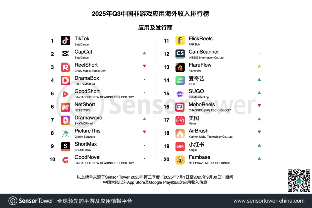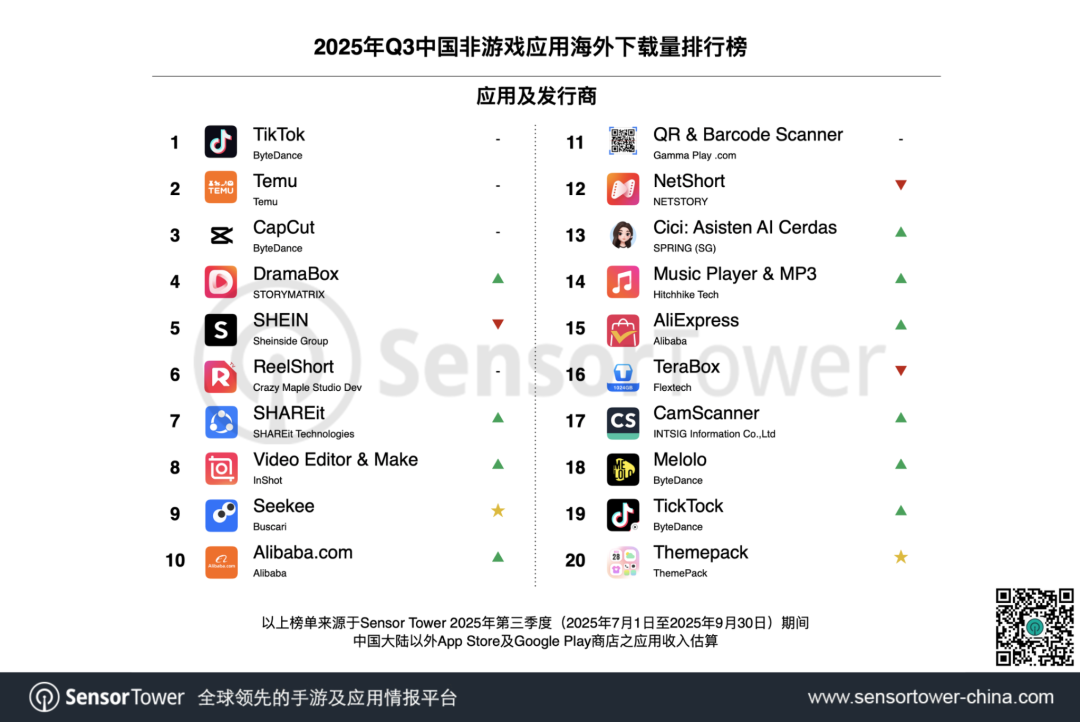 Sensor Tower最新数据显示,2025年第三季度(7月1日至9月30日,下称“Q3”),中国非游戏移动应用在全球市场延续强劲增长势头。以短剧为代表的内容娱乐类应用,凭借暑期档内容布局与社交裂变策略实现显著突破;AI工具应用在垂直场景中加速落地;跨境电商平台则持续深耕全球化供应链与内容化营销。Q3数据充分体现出中国开发者在内容创新、技术赋能及新兴市场拓展方面的卓越实力。