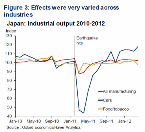 报告指出,除汽车行业外,2011年的日本地震对全球产量的影响也相对温和,持续时间也很短。