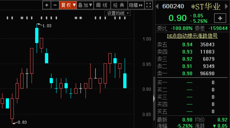 *ST华业的跌停,使公司再度面临面值退市。此前*ST华业曾四度濒临面值退市被救起。截至昨日收盘,*ST华业股票已连续17个交易日收盘价格均低于1元。哪怕公司收盘股价今日再微跌1分钱,也都意味着*ST华业将不能跨过退市之槛。