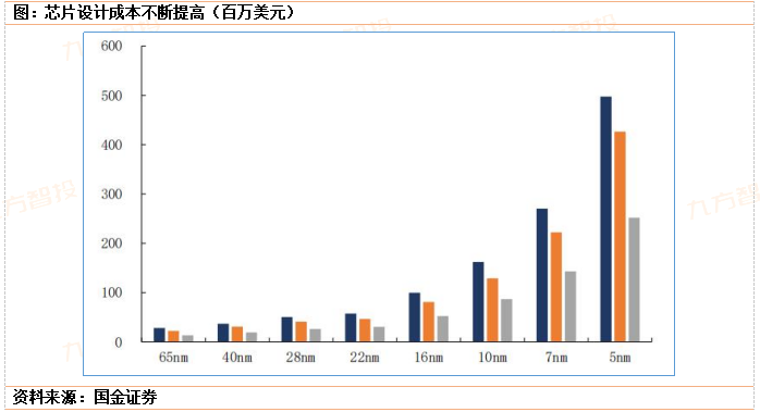 (1)设计瓶颈,传统的SoC是将不同类型计算任务的计算单元设计在一块晶圆上,并且每个计算单元都采用统一的工艺制程,导致SoC芯片上各个单元需要同步进行迭代,这样不仅会使得系统重构风险高,同时也会使得芯片设计成本越来越高,根据行业经验数据,设计一颗28nmSoC芯片成本约为0.5亿美金,7nm需要3亿美金,5nm需要5亿美金,3nm则可能达到15亿美金。