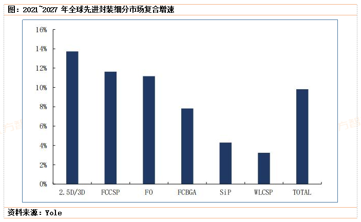 根据Yole预测,先进封装市场在2021~2027年间复合增长率将达到9.81%,至2027年市场规模将达到591亿美元,其中受益于AI相关的高速通信领域的发展,2.5D/3D封装将成为成长最快的板块,复合增长率将达到13.73%,至2027年市场规模将达到180亿美元。