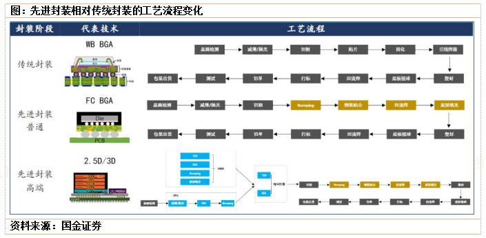 (1)FC新增Bumping、回流焊、底部填充环节。一般情况下,行业将FC(FlipChip,倒转)作为传统封装和广义先进封装的临界点,以结构最相近的WBBGA和FCBGA作对比,后者所代表的先进封装相较前者所代表的传统封装会多出Bumping工序,由此延伸出回流焊、底部填充等新增工序要求。
