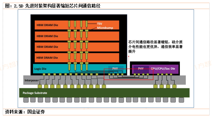 (1)通过1级封装显著缩短线路传输距离,较传统封装大幅度提升效率。沿用前文的例子,传统封装芯片间的传输将经历“芯片-载体-PCB-载体-芯片”这一较长的过程,而先进封装通过在1级封装加入中阶层等方式缩短了芯片间传输距离,并且采用介电性能更好的硅材料,传输损耗进一步降低,以当前较常见的2.5D先进封装架构来看,逻辑芯片与存储之间的通信过程为“芯片-中阶层-芯片”,通信路径大大缩短,通信效率和功耗性能都显著提升。