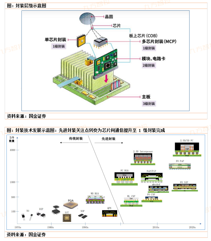 2)先进封装,两个发展阶段,即2000~2010年以MCM为代表的多芯片封装阶段、2010~至今以2.5D/3D为代表的立体封装阶段。该阶段技术变革的重点开始转向优化芯片主体对外连接方式,即开始关注1级封装技术的优化,最具有代表性的转变就是芯片传统对外连接方式WireBonding变成了FlipChip,这一转变提高了1级封装层面连接方式的灵活性,由此延伸出后续的2.5D/3D等高端先进封装方式。