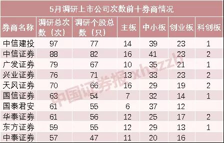 哪些券商最勤奋?梳理发现,5月调研上市公司次数最多的三家券商是中信建投中信证券广发证券,这三家券商也是4月调研最活跃的券商,涉及上市公司分别为77家、82家、67家。