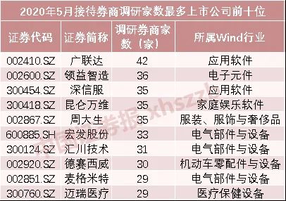 例如,5月广联达共接待42家券商调研,数量在被券商调研上市公司中位居第一,根据Wind行业分类,公司属于应用软件行业。排名第二的领益智造属于电子元件行业,5月共被36家券商调研。