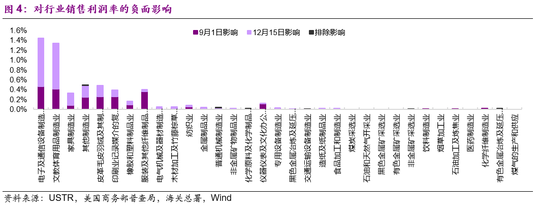 边际上推迟征收关税对销售利润率影响最大的行业是电子及通信设备制造业(0.98%)、文教体育用品制造业(0.92%)、家具制造业(0.25%)(图4)。