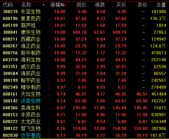 医药板块今日盘中再度活跃,截至收盘,东宝生物、复星医药、康华生物、西藏药业、海正药业、新华制药、威尔药业、海辰药业、精华制药等涨停。