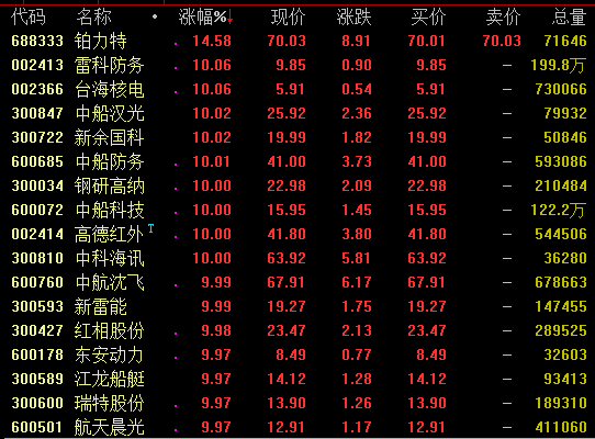 军工板块今日盘中再度拉升,截至收盘,铂力特涨逾14%,雷科防务、台海核电、中船汉光、新余国科、中船防务、钢研高纳、中船科技、高德红外、中航沈飞等涨停。