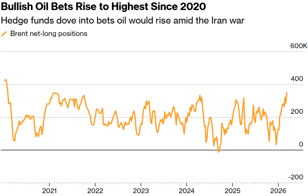 在原油市场历史上波动最剧烈的一周拉开序幕之际,对冲基金对布伦特原油的看涨情绪达到了六年来的最高点。