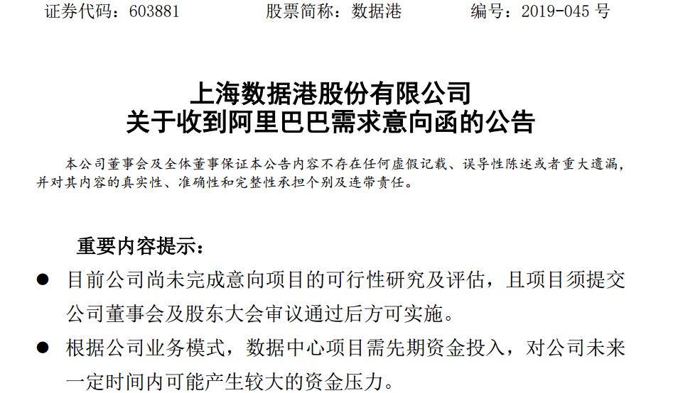 数据港昨天公告称, 公司于近日收到收到阿里巴巴(中国)有限公司采购部的《数据中心需求意向函》。随着阿里巴巴集团业务的高速发展,阿里巴巴拟与公司在未来一定时间合作建设HB41、HB33、GH13、JN13数据中心。