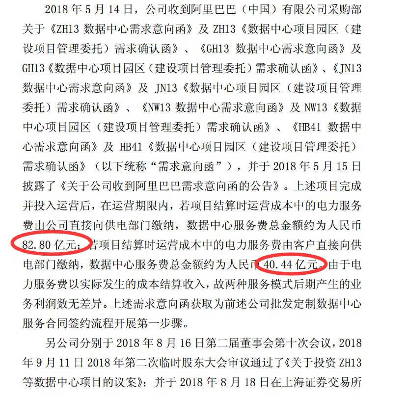 事实上,阿里里巴巴并非数据港的新客户。早在2018年5月,数据港就收到阿里发来的需求意向函,阿里意向与公司在国内合作建设五个数据中心,项目合计总服务费高达40.44(不含电费)/82.80(含电费)亿元。今年3月,数据港就ZH13、GH13、JN13、NW13、HB41等数据中心项目与阿里签订了包含主要合同条款的且具有法律效力的合作备忘录。