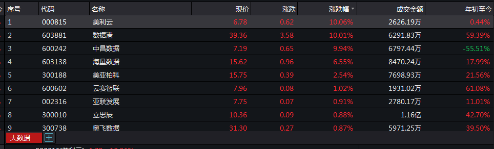 除数据港外,大数据板块整体异动拉升。截至午间收盘,美利云涨停,中昌数据涨超9%,海量数据涨超6%,美亚柏科、云赛智联、亚联发展、奥飞数据等多股跟涨。