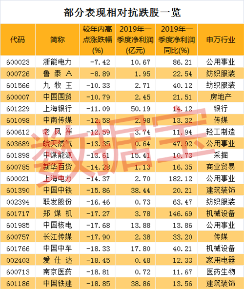 藏格控股回调幅度最大,与年内高点相比,其累计下跌47.73%。藏格控股今日盘中一度创下四年来新低,随后股价反弹,最终收涨3.29%。浙能电力、鲁泰A、九牧王、中国国贸、上海银行等股表现相对抗跌,较年内高点回调幅度不足15%。其中浙能电力回调幅度最小,仅7.42%。今年一季度浙能电力实现盈利10.67亿元,同比增长86.21%。