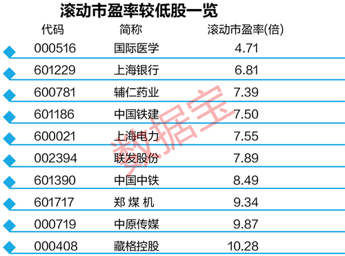 从估值角度来看,9股最新滚动市盈率在个位数水平。滚动市盈率最低的是国际医学,为4.71倍。上海银行、辅仁药业滚动市盈率分别为6.81倍、7.39倍。中国铁建、上海电力、联发股份、中国中铁、郑煤机、中原传媒等滚动市盈率均在10倍以下。
