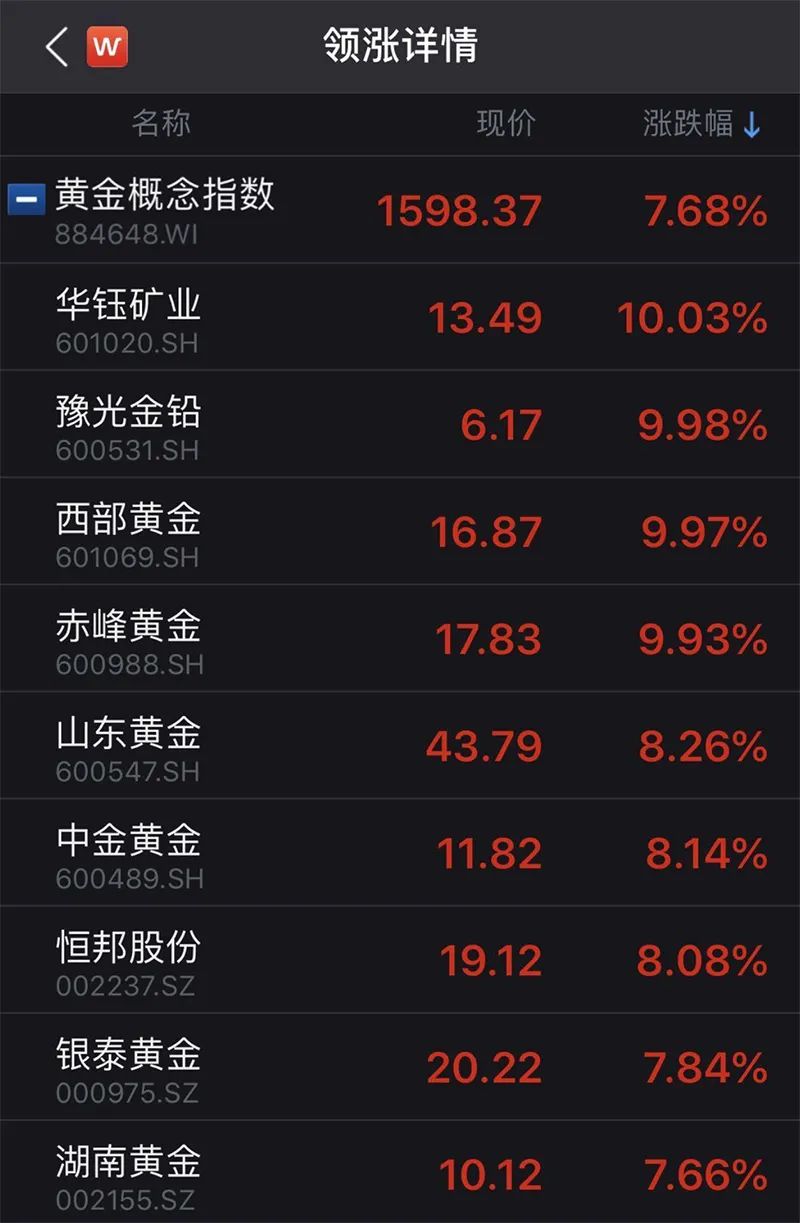 A股市场的黄金概念股也集体飙涨,截至中午收盘,西部黄金涨停,赤峰黄金、山东黄金、中金黄金涨幅均在8%以上。