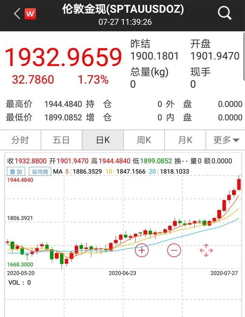 此前的7月8日,国际金价成功突破1800美元/盎司。仅用了16天时间,金价再度突破1900美元/盎司。