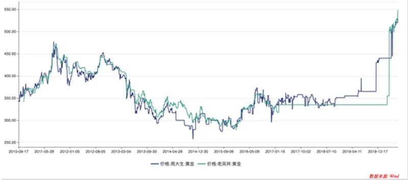 Wind数据显示,截至7月24日,老凤祥、周大生、老庙等国内知名金店的实物黄金价格处于530元/克至550元/克的区间内,均创下了近十年的新高。