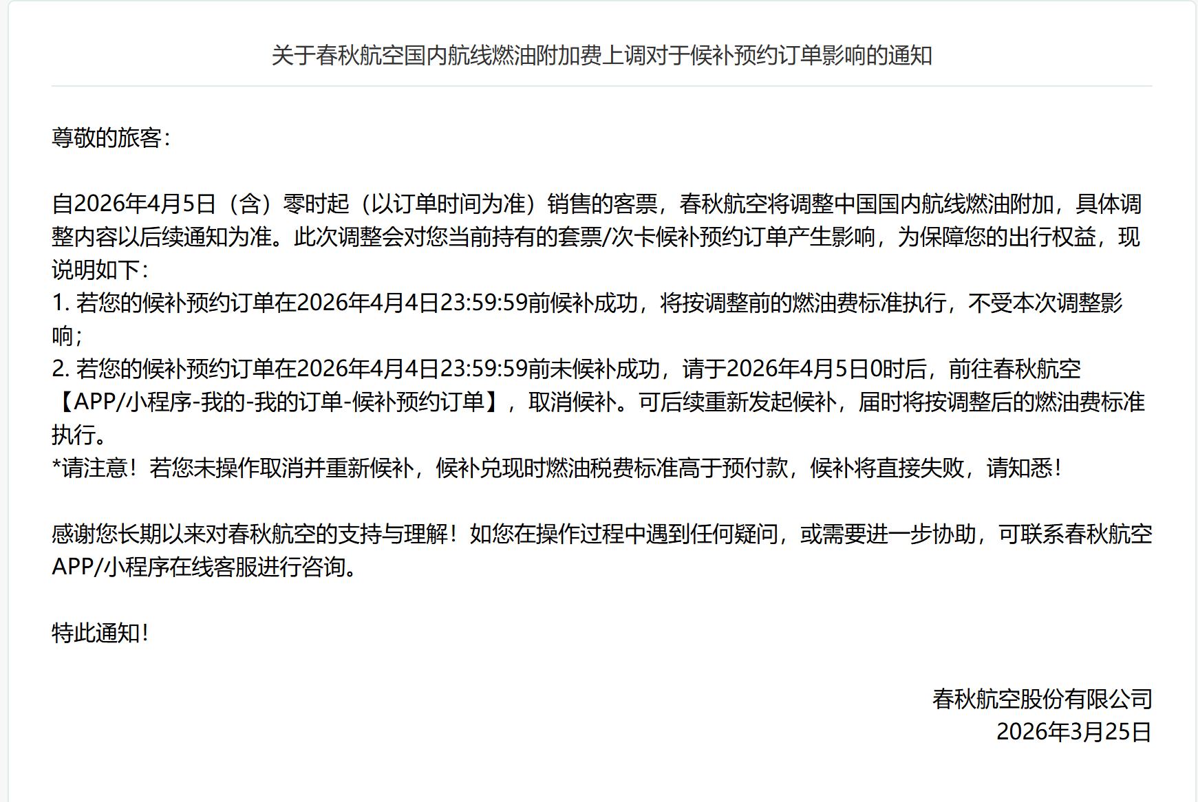 受中东局势持续影响,国际油价在100美元高位震荡运行,全球多家航司已密集上调国际机票燃油费。在此背景下,国内消费者对国内航司即将上调燃油费的预期不断走强。3月25日,春秋航空(601021.SH)发通知称,自2026年4月5日零时起销售的客票,将上调国内航线燃油附加费,具体调整内容以后续通知为准。