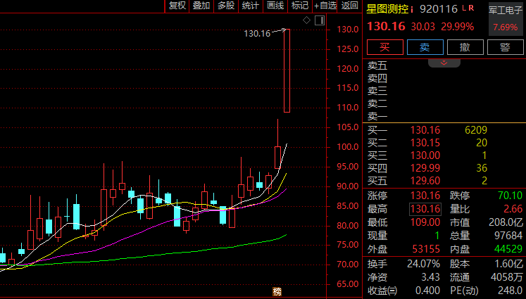 军工股强者恒强,航天装备方向继续飙升,板块指数单边大涨逾9%,再度创历史新高。星图测控临近午间收盘30%涨停,理工导航、中钢洛耐等都股也在午间快收盘前20cm封板,电科芯片、中国卫星等逾70股强势涨停或涨超10%。