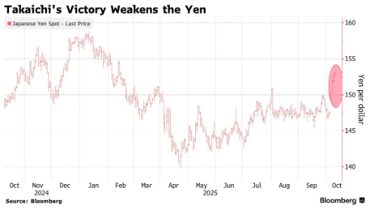 由于在周六举行的执政党自民党领导层选举中,高市早苗获胜,市场对加息的预期大幅降低,日元随即开始迅速贬值。交易员们认为,在 10 月 30 日日本央行公布下一次政策决定时,加息的可能性约为 25%,而上周这一概率为 68%。