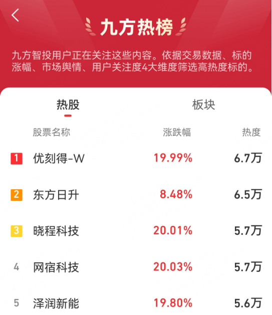 九方热榜:优刻得-W,东方日升,晓程科技,网宿科技,润泽新能