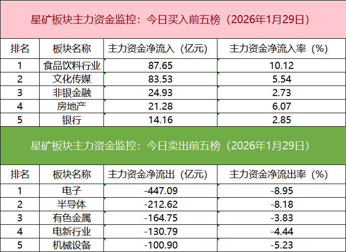 从主力板块资金监控数据来看,食品饮料行业主力资金净流入居首。