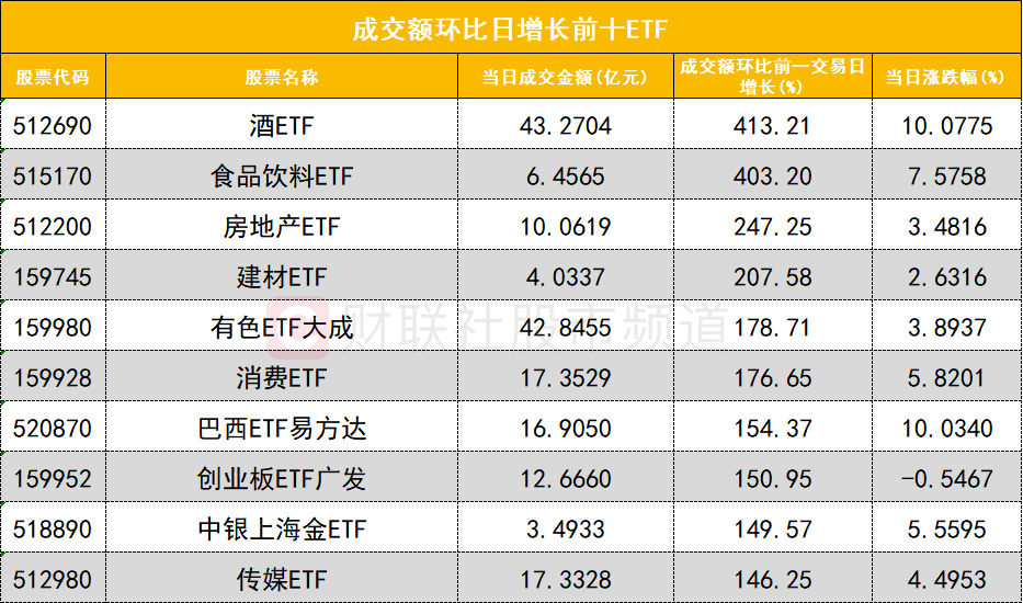 从成交额环比增长前十的ETF来看,酒ETF(512690)成交额环比增长413%位居首位;食品饮料ETF(515170)成交额环比增长403%位居次席。