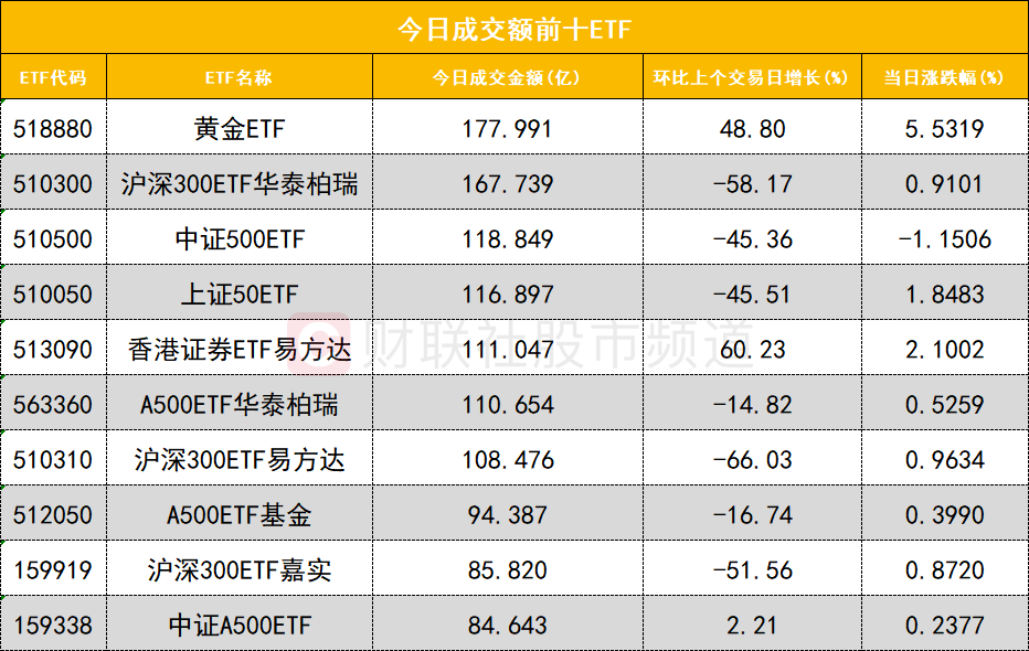 从成交额前十的ETF来看,黄金ETF(518880)成交额位居首位,沪深300ETF华泰柏瑞(510300)成交额位居次席。