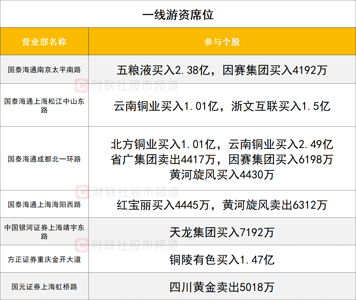 一线游资活跃度一般,有色金属板块依旧强者恒强,铜陵有色走出5天4板,获一家一线游资(方正证券重庆金开大道)买入1.47亿,同时深股通买入2.41亿。五粮液获一家一线游资(国泰海通南京太平南路)买入2.38亿。