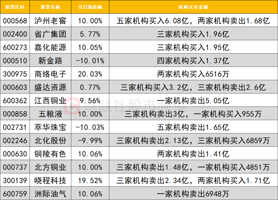 【数据看盘】五家机构集体抢筹泸州老窖 铜陵有色龙虎榜现多空博弈