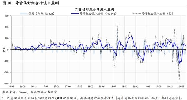 4月中下旬以来,北上资金流入动能亦明显放缓,单周净流入强度在50亿人民币以下。当前尽管北上资金每周仍保持净流入,但净流入的规模较低,与此前诸如2019年1-3月、2019年12-2020年1月单周保持在200亿元的净流入水平有较大的差距。表明当前北上资金配置意愿开始弱化,更多的在于结构性的配置为主。我们在外资偏好组合的净流入强度当中能够较为清晰的看出,北上对于其偏好标的的净流入意愿已开始放缓,这与我们在全球看到的权益资本流入动能减弱的观察是一致的。