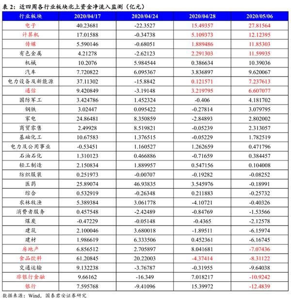 近两周以来北上资金流入以结构性的特征为主,成长成为其增配的方向。结构性的配置特征其本身表明了北上资金的A股整体配置意愿正在减弱。从近两周我们可以看到,前期涨幅较大的食品饮料北上资金正在净流出,虽然规模仍较小但存在扩大的迹象。地产和金融在前期流入后转向流出。而成长成为北上流入放缓当中增配的方向,其中,电子、计算机、传媒本周净流入均超10亿元,包括新能源、通信在内的成长板块北上资金净流入近两周均有所扩大。