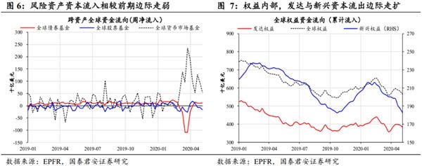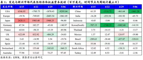 近两周以来,全球权益资本相较前期修复的动能显著减弱。表现为三个方面:1)全球股票型基金资本流出扩大。本周全球股票基金净流出162.22亿美元,上周净流出67.10亿美元,股票型基金流出规模有所扩大。2)从资本流动的结构看,发达与新兴流出均扩大。本周发达市场基金净流出117.01亿美元,上周净流出32.75亿美元,相较两周前发达市场基金整体净流入的动能明显减弱。新兴市场基金净流出45.21亿美元,相较上周流出34.35亿美元亦有所扩大。3)全球头部经济体权益资本流出边际上升。从主要经济体股票基金看,近两周不论是发达市场还是新兴市场,头部经济体大多为净流出,与此前全球头部整体流入有较大变化。以上数据表明,全球权益资本的修复动能正在边际减弱,波动性上升。