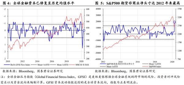 全球流动性修复动能最快的阶段或已接近尾声。全球投资者当前对于市场的定价非常乐观,除对“超宽松”的货币政策预期外,还隐含着对疫情缓和以及进一步全球财政刺激的乐观预期。S&P500指数期货非商业净头寸已达到2012年以来的最高,其中主要来自于多头合约的大幅增加,表达了当前市场投机情绪处于较高的水平。此外,全球金融资本也已快速修复至历史均值的水平。而潜在变化在于,央行宽松态度边际弱化,全球新增病例平坦化后迟迟未见下行。当前投资者过于乐观的预期待修正,流动性修复动能最快的阶段或已接近尾声。