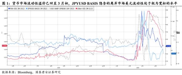 跨市场隐含的流动性水平已较为充裕。过去一个多月,在全球央行史无前例的大幅扩表后,货币市场的流动性溢价、信用市场的信用风险溢价以及权益市场的股票波动率大幅回落。尤其是货币市场流动性溢价FRA/OIS、Libor/OIS已回至3月初的水平,JPYUSD BASIS已远高(图1坐标轴逆序)于2019年及2020年初。以上跨市场的变动所隐含的市场流动性水平已达到较为宽松的水平。