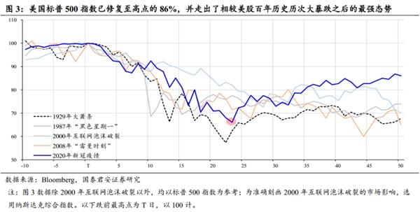 在3月22日我们发布了一篇重要的流动性专题《Matter of Time:流动性冲击高峰已现》,在全球最恐慌之际我们指出市场低估了美联储行动的能力以及预判市场与流动性风险在未来将得到修复。此后,3月23日美国各大指数见底,中国A股也在当天见到了阶段性低点。然而时至今日,我们能够看到,美国纳斯达克指数已经抹去2020年的跌幅并接近2020年2月的高位;美国标普500指数也已修复至高点的86%并走出了相较美股百年历次大暴跌之后的最强走势表现。这其中有三个核心因素:
