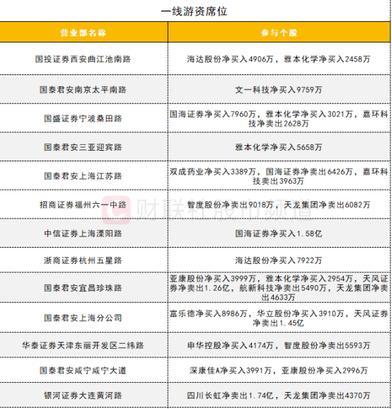 一线游资活跃度一般,天风证券遭两家一线游资席位合计卖出2.71亿;国海证券获两家一线游资席位合计买入2.37亿;四川长虹遭银河证券大连黄河路营业部卖出1.74亿。