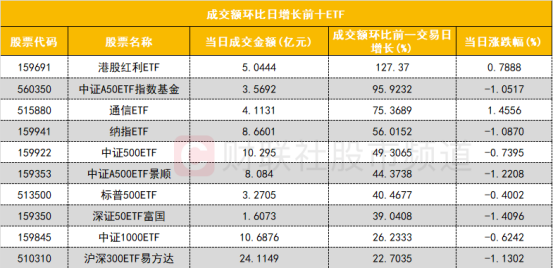 从成交额环比增长前十的ETF来看,港股红利ETF(159691)成交额环比增长127%位居首位;通信ETF(515880)成交额环比增长75%位居第三位。