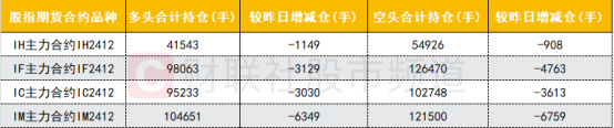 四大期指主力合约多空双方均减仓,IH合约多头减仓数量较多;IF、IC、IM合约空头减仓数量较多,其中IF合约空头减仓数量明显大于多头。