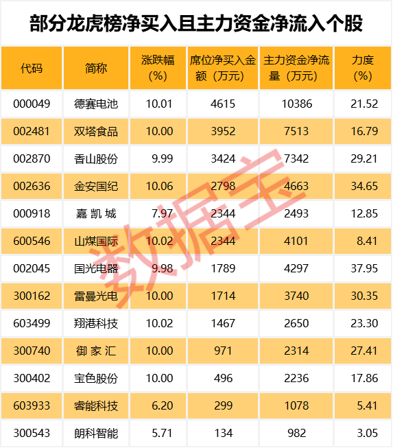 从盘口资金流向来看,主力资金净流入超千万且龙虎榜净买入个股共有12只,其中德赛电池、双塔食品、香山股份等个股资金净流入金额最大。净流入力度最大的个股有国光电器、金安国纪、雷曼光电,净流入力度分别为37.95%、34.65%、30.35%。