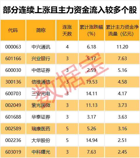 值得注意的是,1245只连续上涨个股中,33只个股期间主力资金累计净流入超过亿元。其中,累计资金流入最多的为中兴通讯,主力资金累计流入11.2亿元。