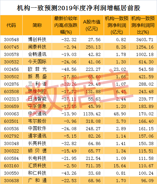 根据5家以上机构一致预测数据,19只科技股今年净利润预测增幅翻倍,3股预测净利润增长10倍以上。