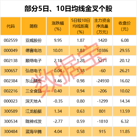 截至7月25日收盘,有57只A股的5日均线主动上穿10日均线,其中亚威股份、德赛电池、顺络电子等个股的5日均线较10日均线距离最大,分别达1.87%、1.83%、1.28%。